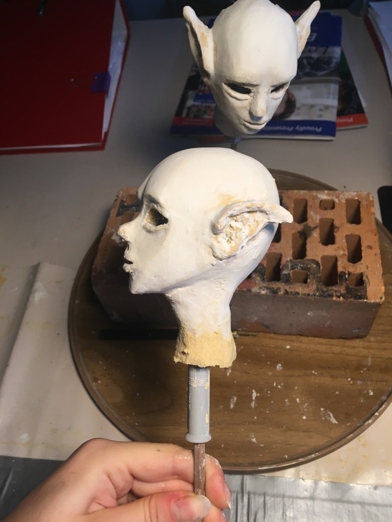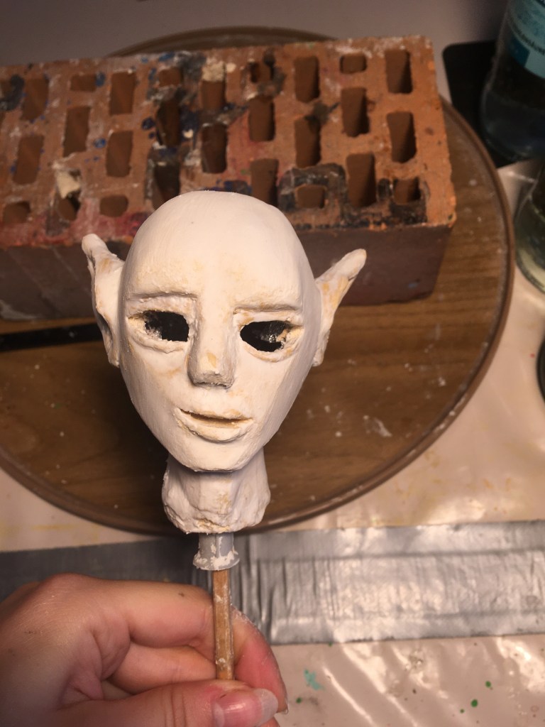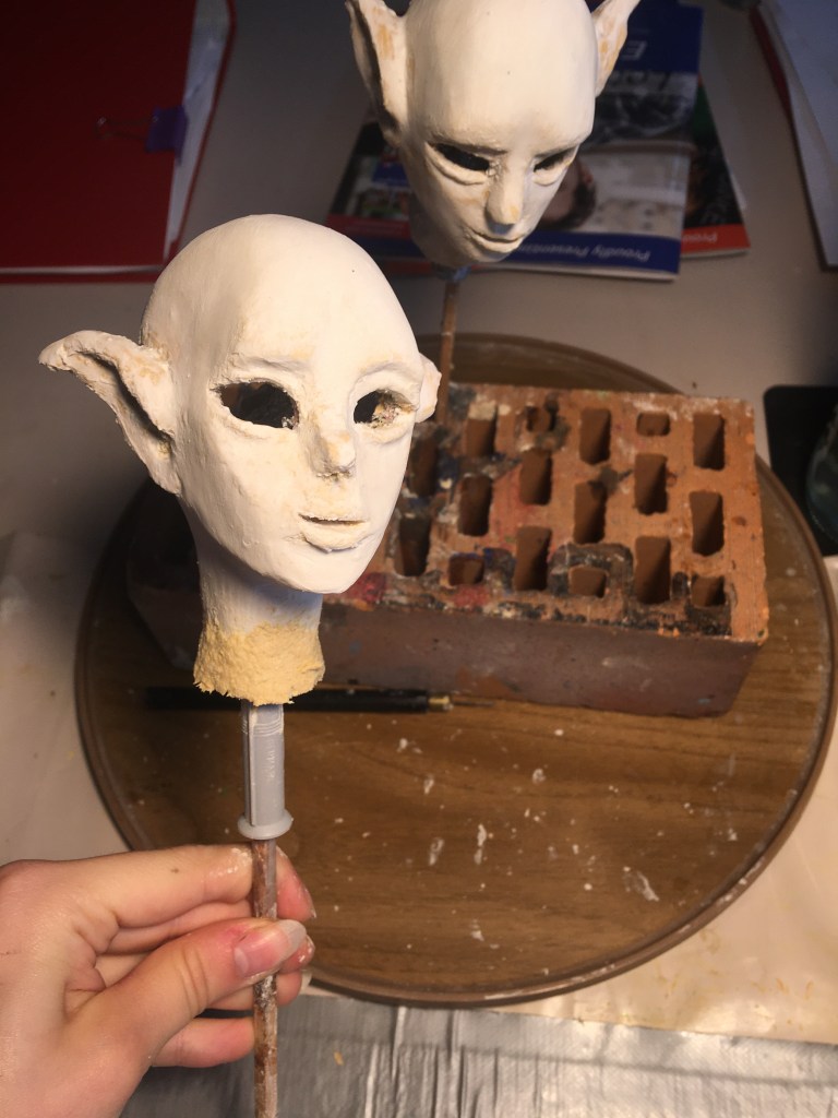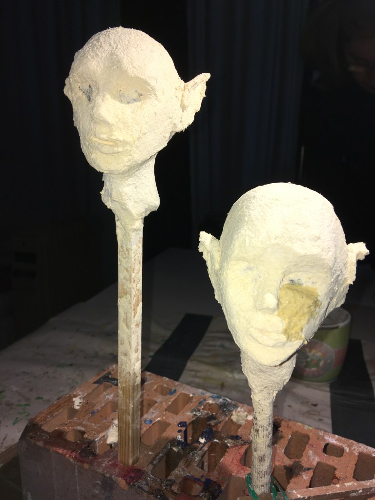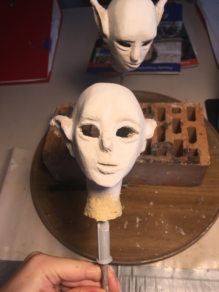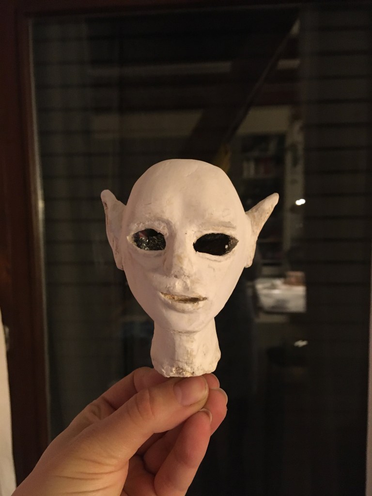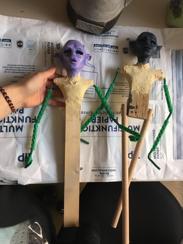 First I formed little heads with tin foil. Then I put peaces of an old newspaper with glue around these balls. Afterwards I started to form the features of their faces with wood paste. These pictures were taken after the wood paste dried. The female Fae- Zerin (the left one on the first picture and the one on the last picture) needed a bit more thats why it was still a bit wet.