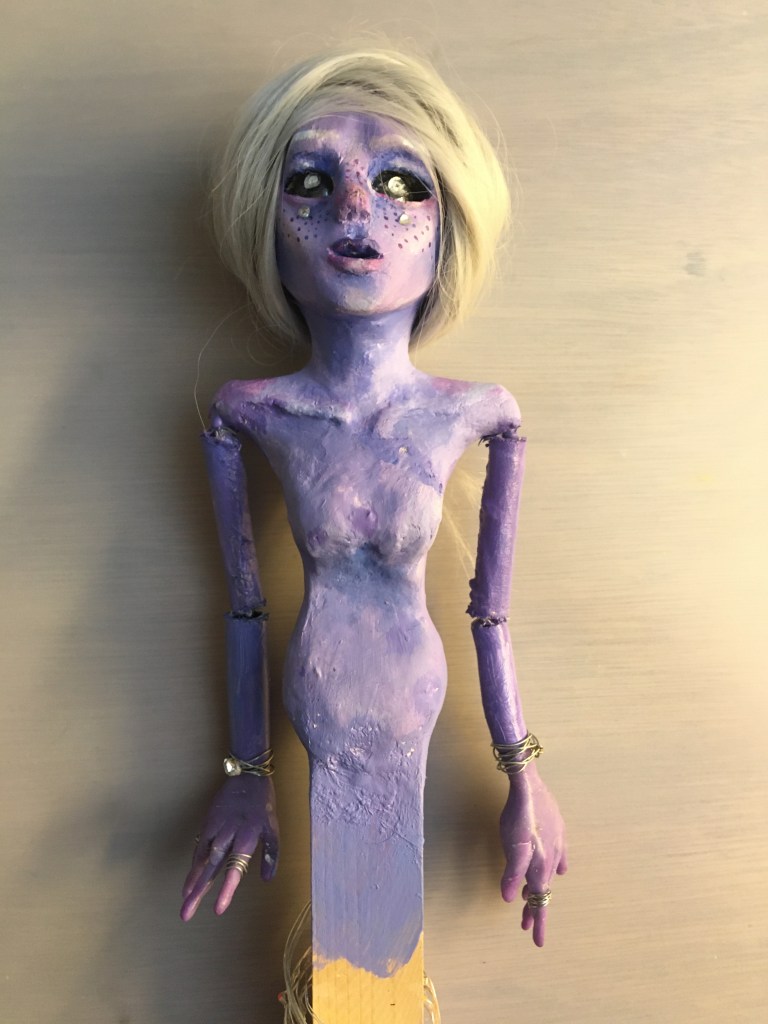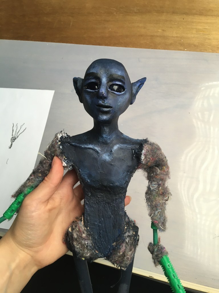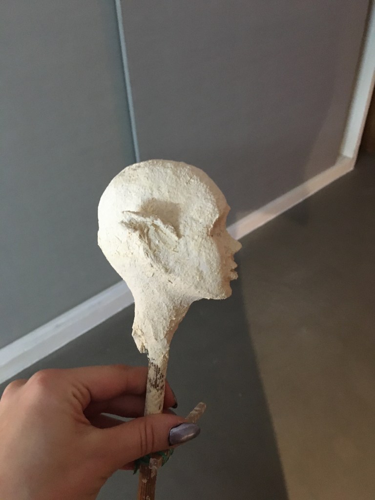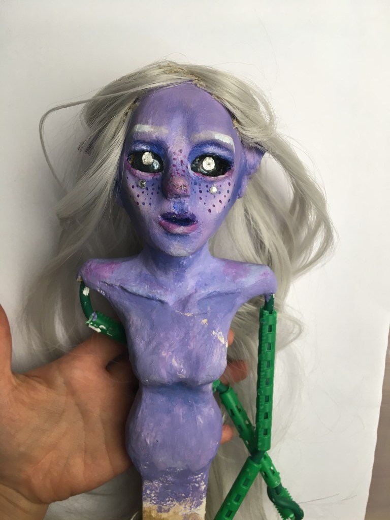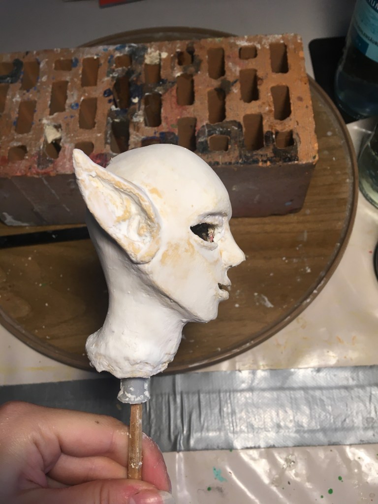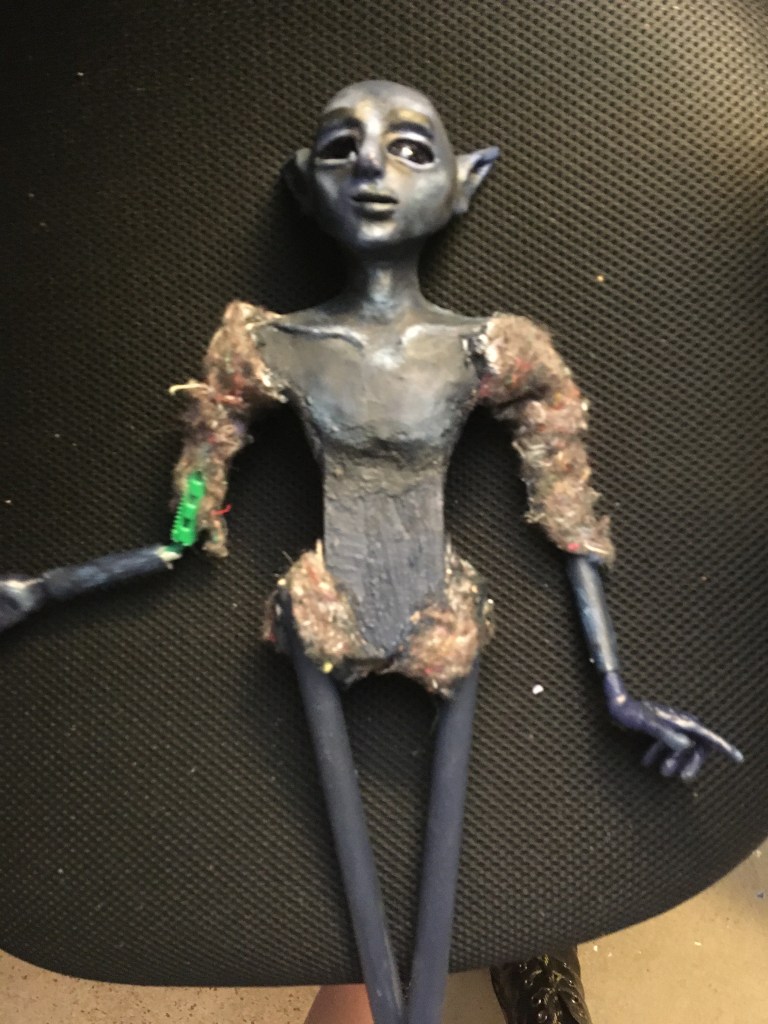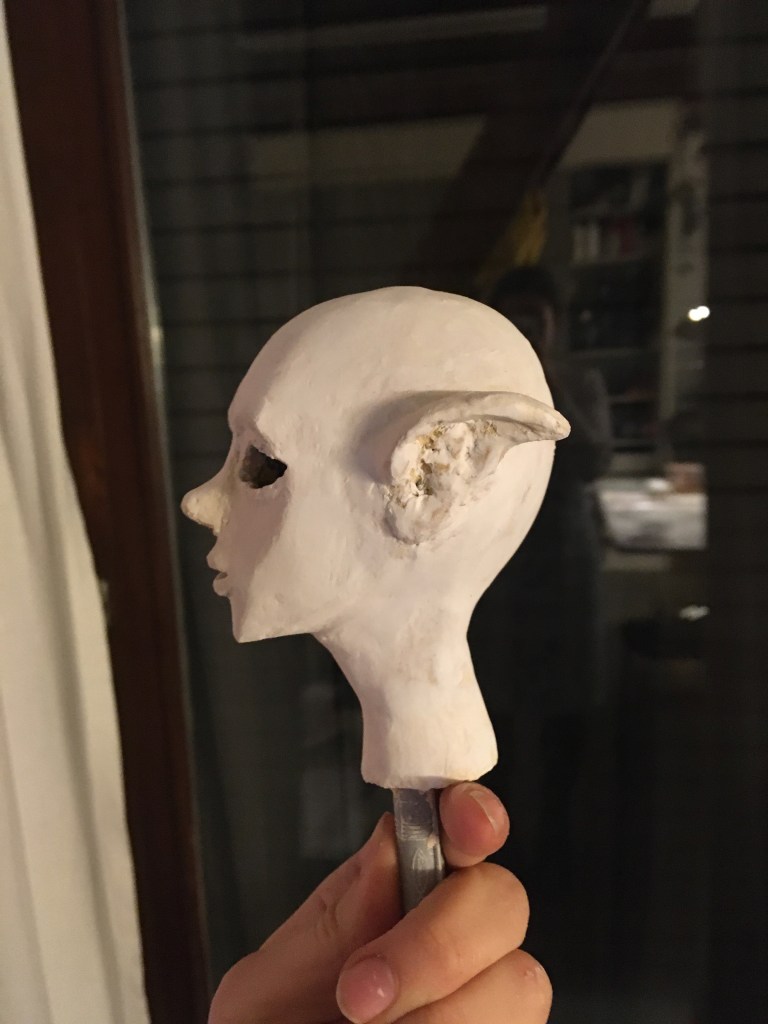 First I formed little heads with tin foil. Then I put peaces of an old newspaper with glue around these balls. Afterwards I started to form the features of their faces with wood paste. These pictures were taken after the wood paste dried. The female Fae- Zerin (the left one on the first picture and the one on the last picture) needed a bit more thats why it was still a bit wet.