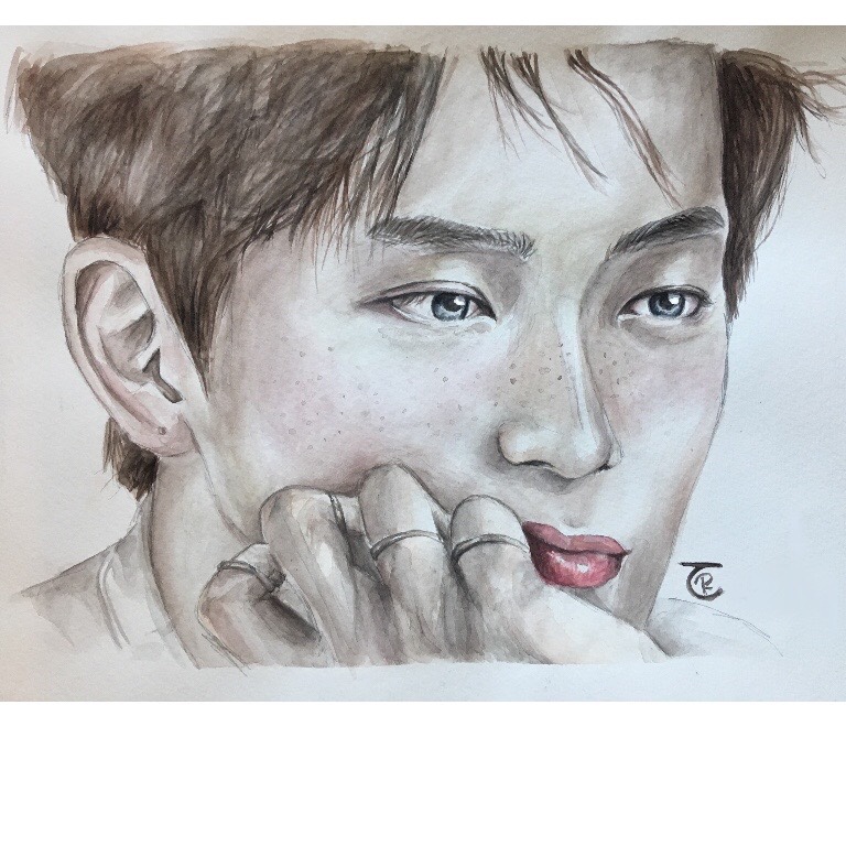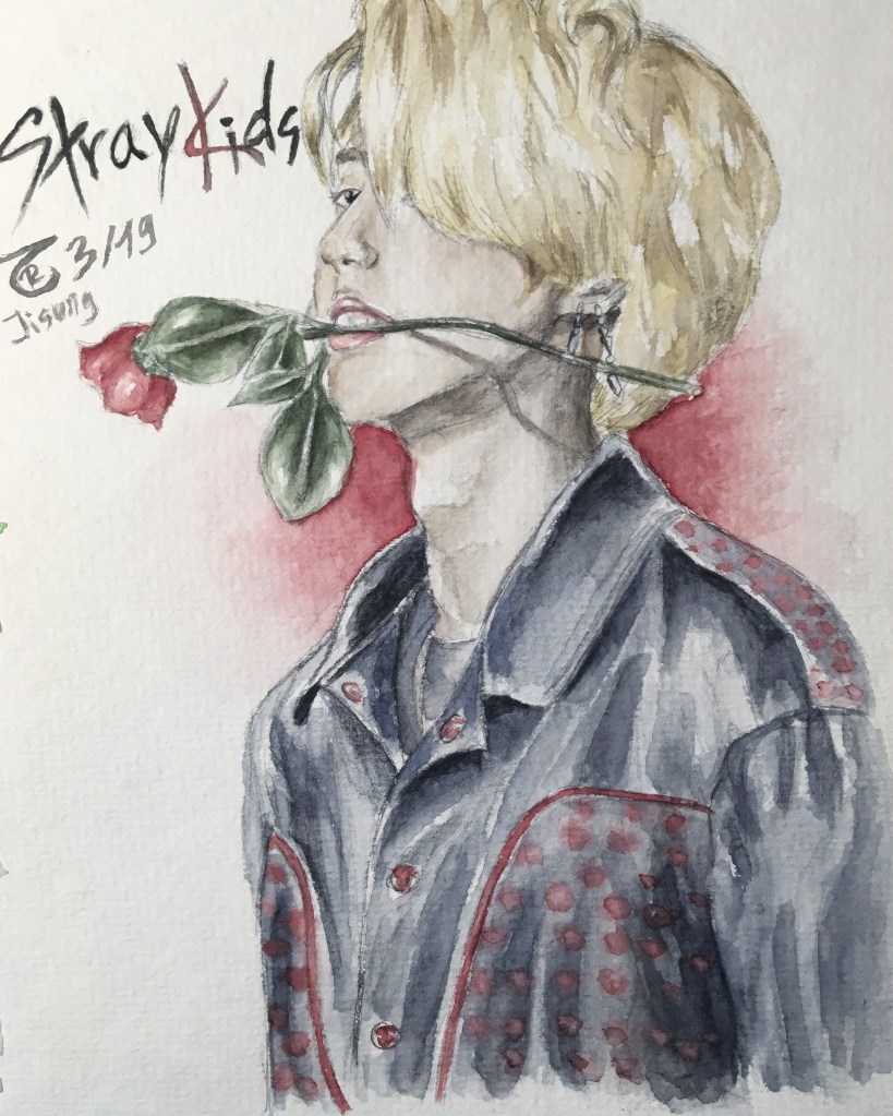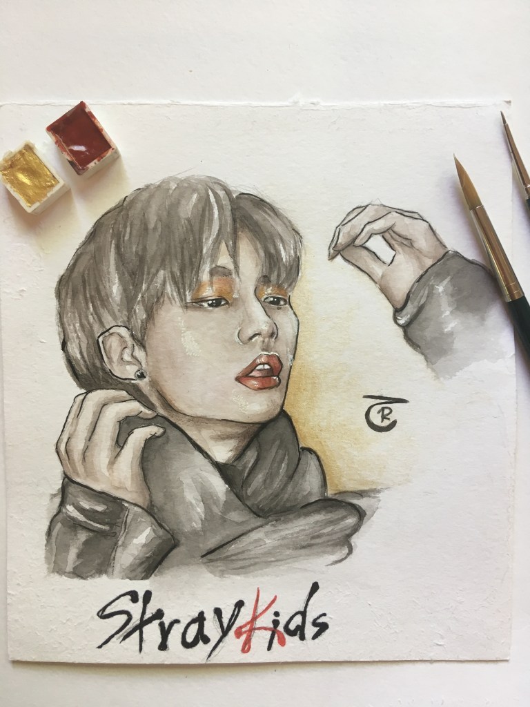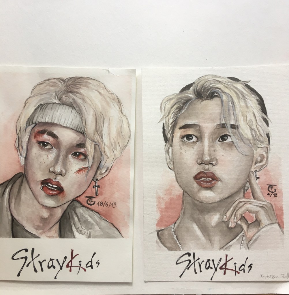 Here you can find variations of my StrayKids paintings. As you can See I got more confident with using watercolors and also got bolder with using different mediums in one painting. Further down this side, you will see similar and even more shocking evolutions of my watercolor art journey!
