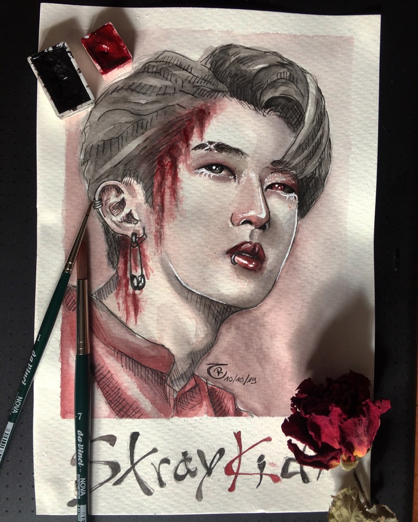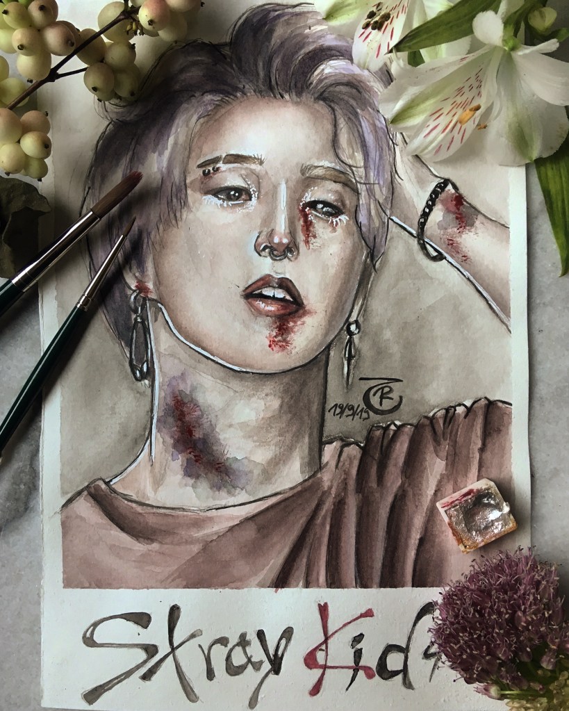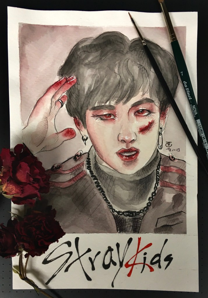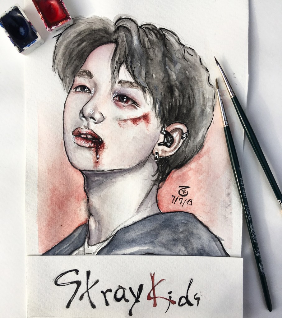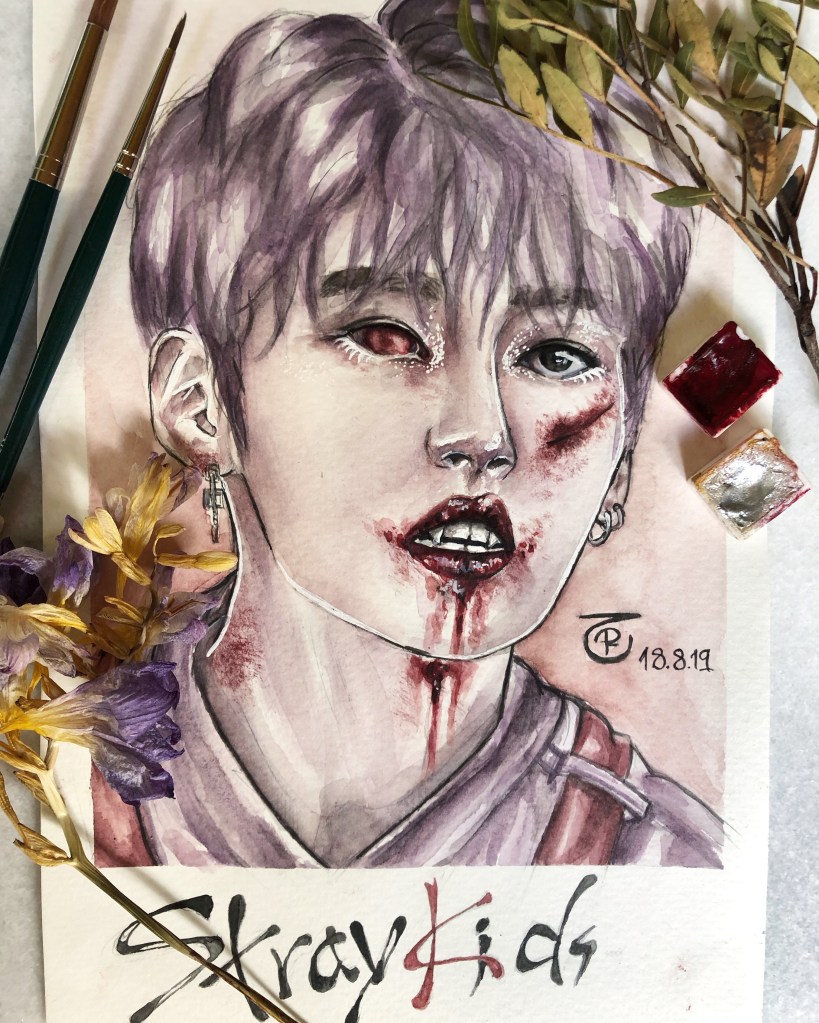I’ve always had a fascination with spooky themes, so it’s no surprise that even during my K-Pop phase, I eventually circled back to eerie art. Once I found my own watercolor style—something that finally felt authentic—I wanted to give my then-favorite group a dark, haunting twist. And that’s how the “Bloody Stray Kids” series was born.