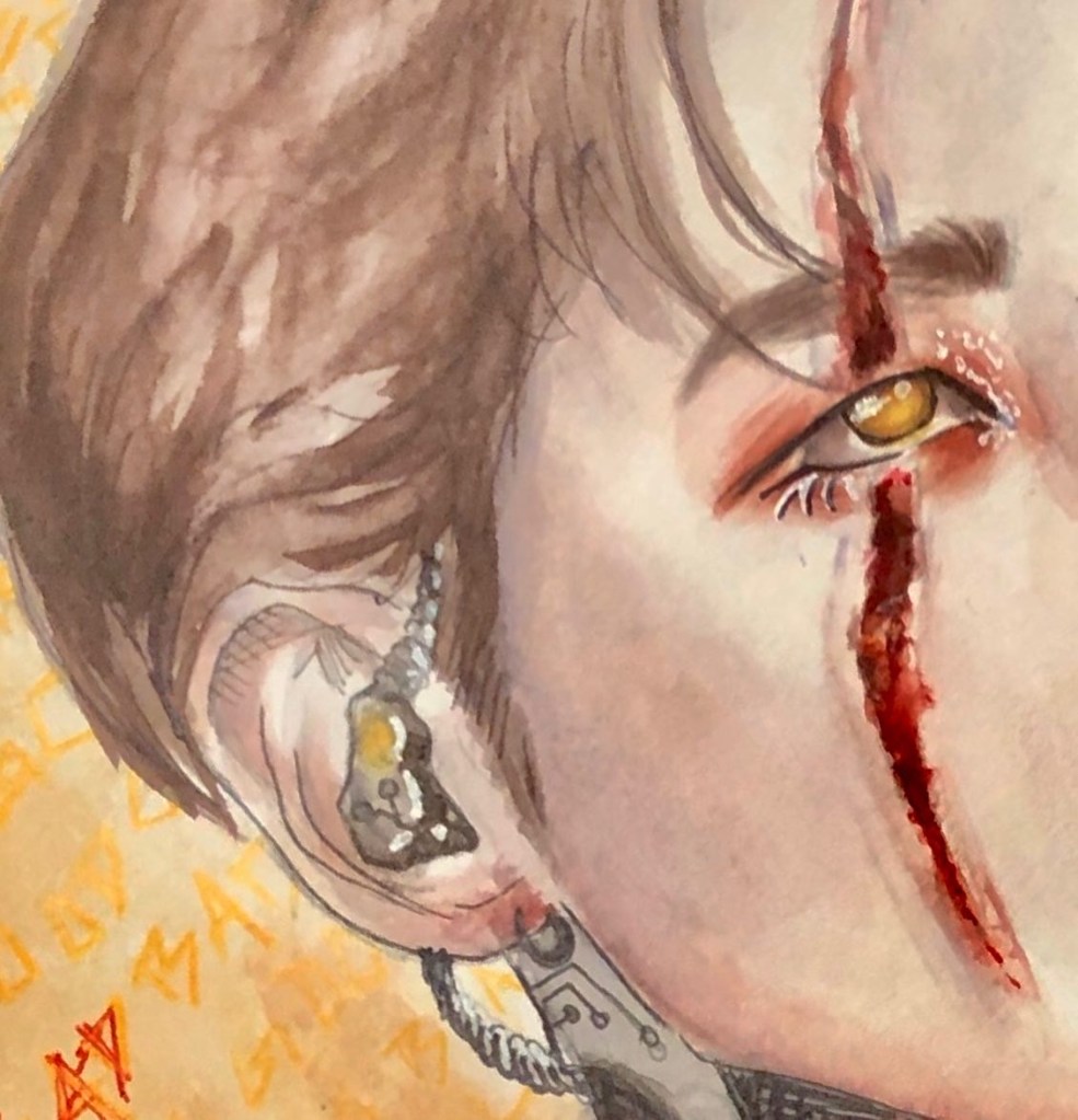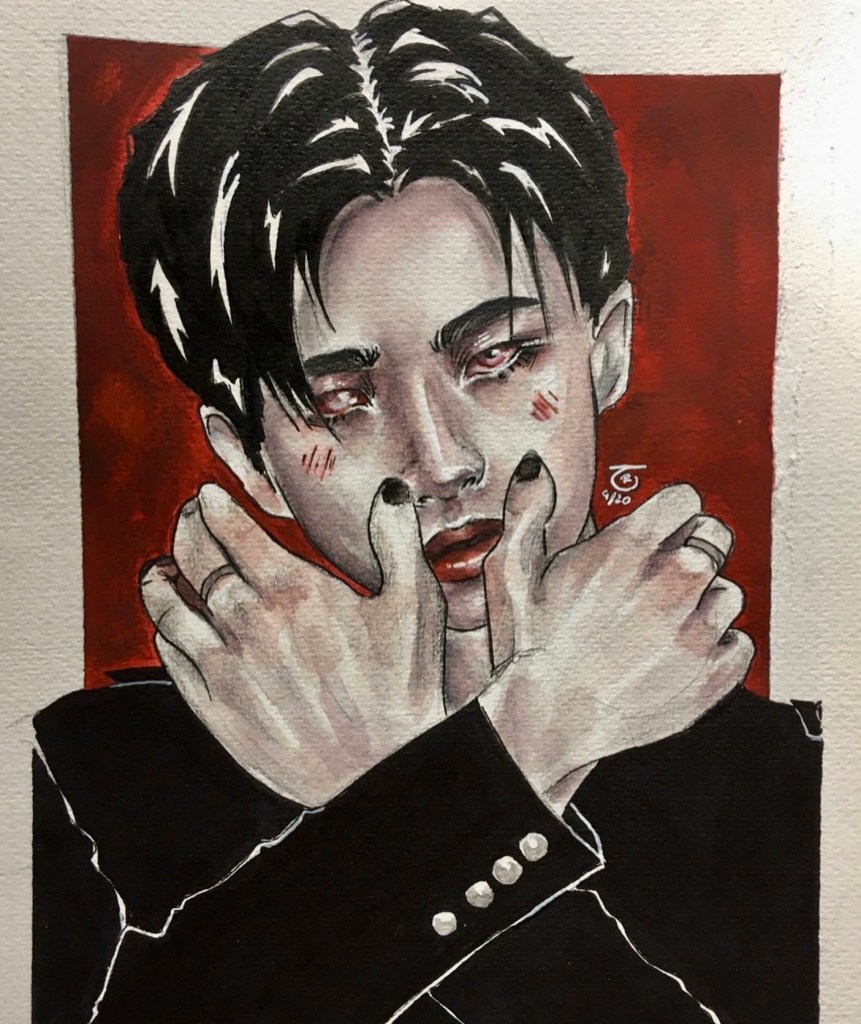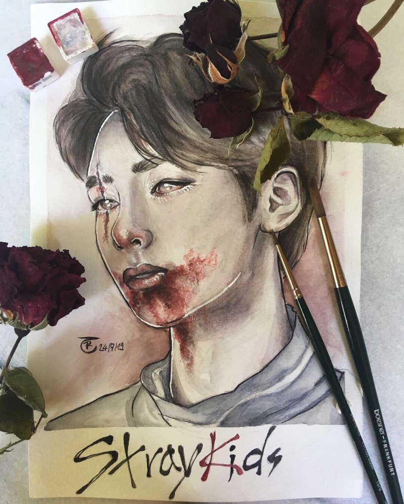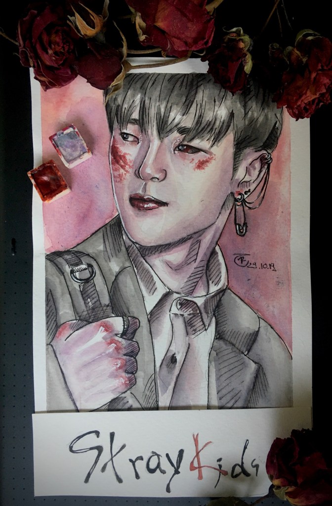 I’ve always had a fascination with spooky themes, so it’s no surprise that even during my K-Pop phase, I eventually circled back to eerie art. Once I found my own watercolor style—something that finally felt authentic—I wanted to give my then-favorite group a dark, haunting twist. And that’s how the “Bloody Stray Kids” series was born.